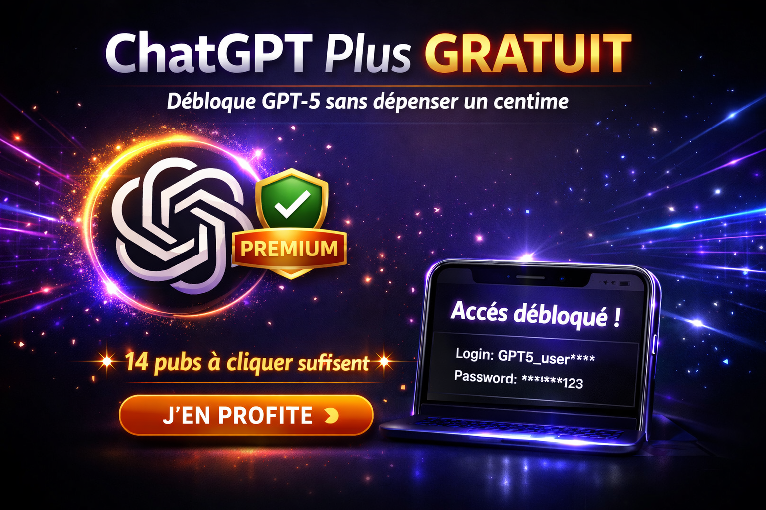 Après avoir cliqué sur la 14e publicité et validé avec « J’ai terminé », un message de félicitations s’affiche. Ensuite, un nouveau bouton devient actif : « Obtenir ChatGPT Plus gratuit ». Cliquez dessus sans hésiter.